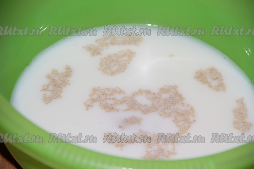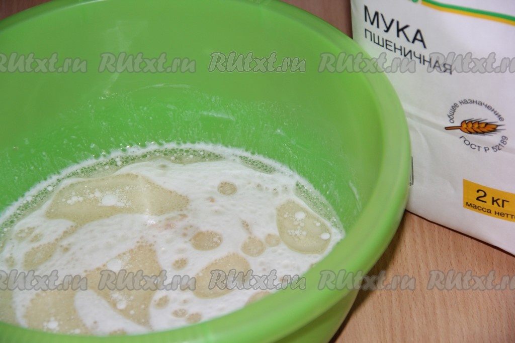 В глубокую миску влить молоко и тёплую воду. Всыпать дрожжи и сахар. Перемешать и оставить в тепле на 15 минут.
