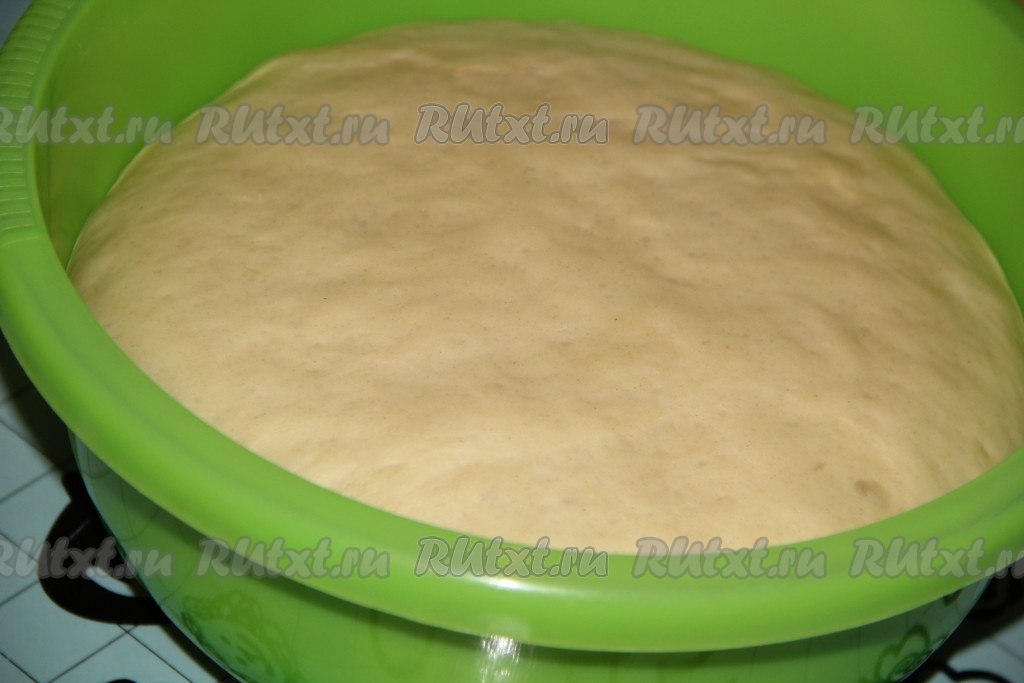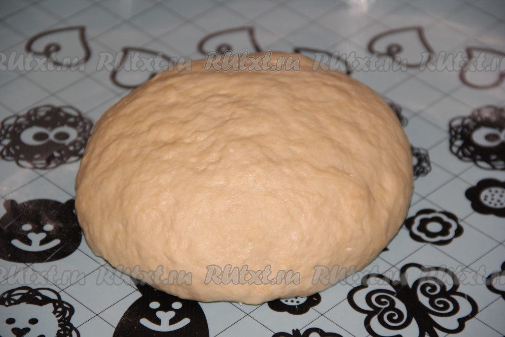Подошедшее тесто выложить на стол, присыпать мукой и слегка обмять.