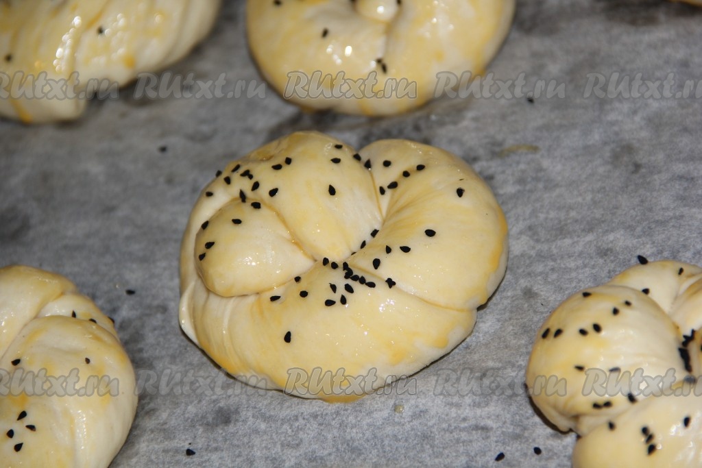 Верх булочек смазать яичным желтком, посыпать тмином и поставить в духовку, разогретую до 180 градусов, примерно на 20-25 минут. Выпекать до золотистого цвета.