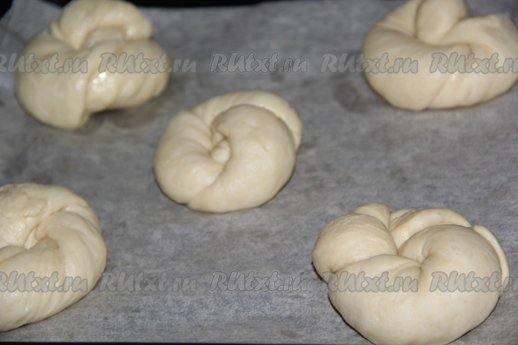Противень для выпекания застелить пергаментом, выложить булочки на противень и оставить в тепле для расстойки минут на 30.