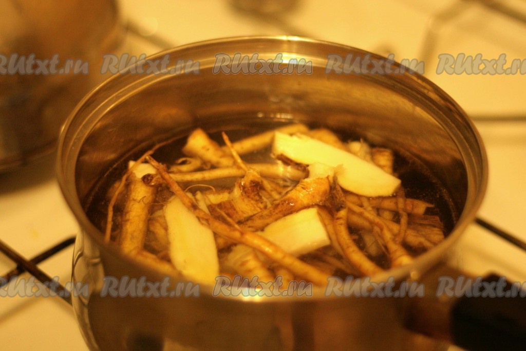 В кипящую воду положить пастернак и варить 5 минут, слить воду.