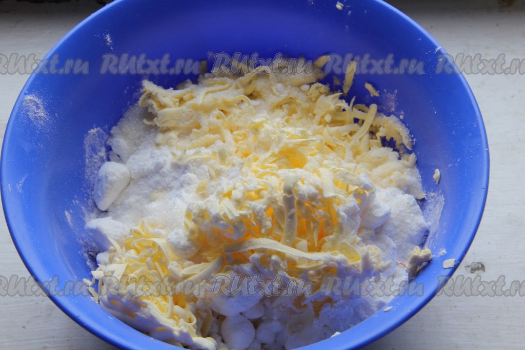 Охлаждённое сливочное масло натереть на крупной тёрке и смешать с 150 граммами сахарной пудры (или сахара), добавить яйцо, растереть вилкой до однородности.