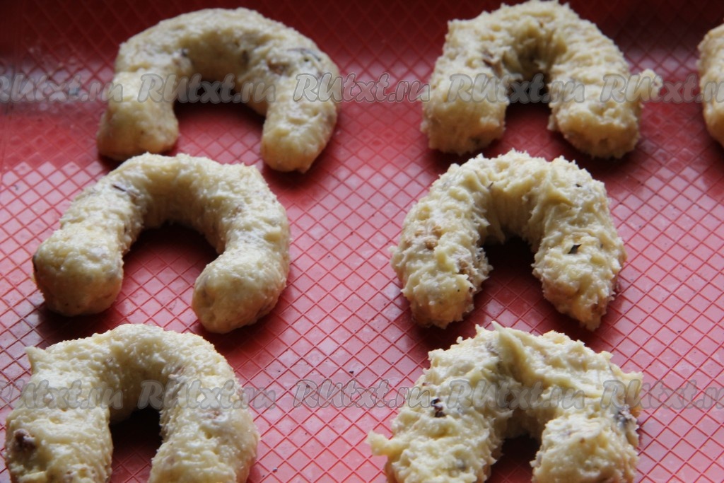 По истечении времени от теста отщипывать небольшие кусочки (размером немного больше грецкого ореха). Из каждого кусочка сформировать подковку и выложить её на противень, застеленный ковриком для выпечки (или пергаментной бумагой). Поставить противень в разогретую духовку и выпекать печенье из грецких орехов минут 15-20 при температуре 180 градусов.