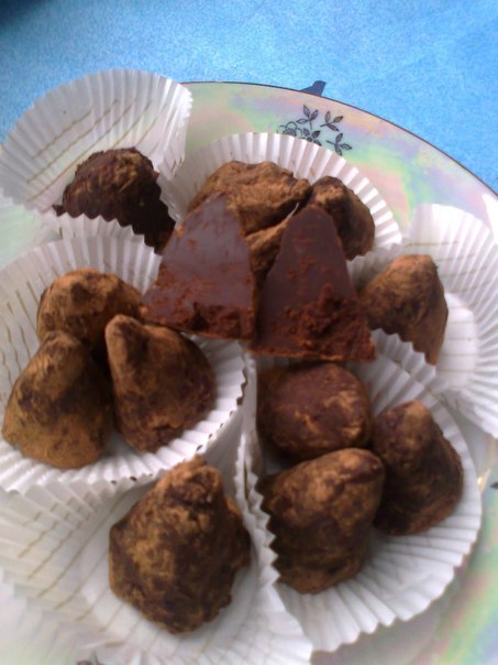 Вот такие замечательные шоколадные трюфели, приготовленные из тёмного шоколада в домашних условиях, у нас получились. Конфеты с орешком тоже очень хороши в разрезе.