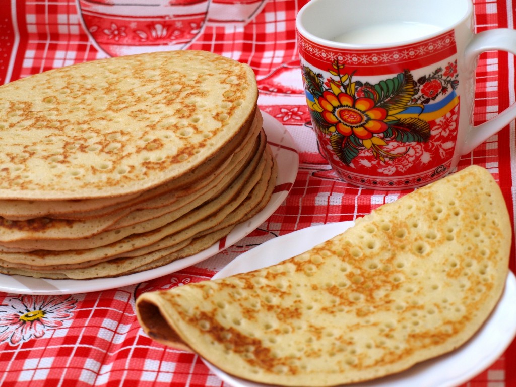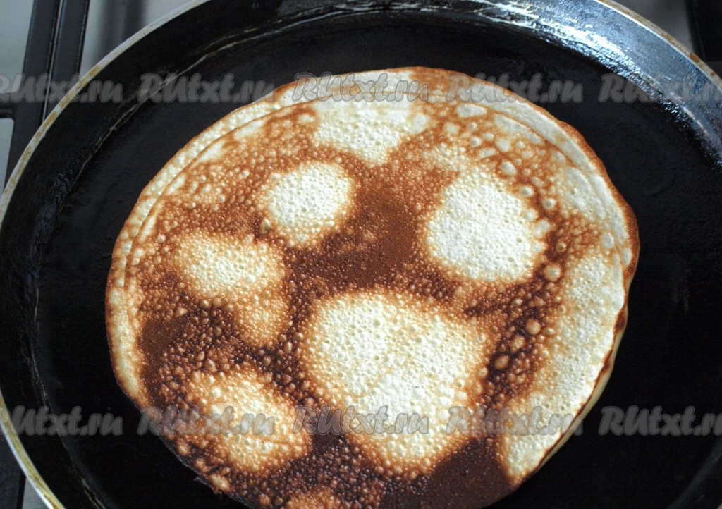 Хорошо разогретую сковороду смазать растительным маслом, влить немного теста и, наклоняя сковороду, равномерно распределить тесто по дну. На поверхности блина начнут появляться пузырьки. Жарить блин с одной стороны до румяного цвета.