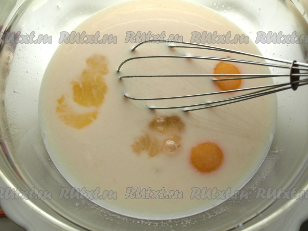 Подогреть молоко, добавить в него дрожжи, сахар и перемешать. Оставить минут на 15 в тёплом месте до появления пенной шапочки. Затем в дрожжевую смесь добавить яйца и взбить венчиком.