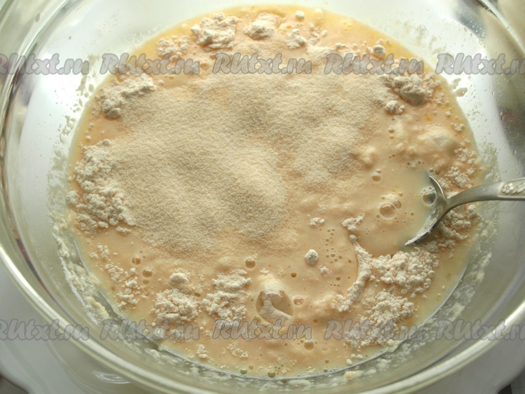 Смешать в миске просеянную муку с манкой, солью и добавить в дрожжевую смесь, тщательно перемешать.