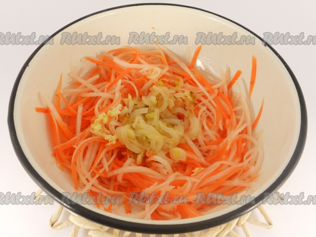 Дайкон и морковку очистить, натереть на тёрке для корейской моркови, переложить в миску, посолить и чуть помять руками. Оставить на 15 минут, после чего слить выделившуюся жидкость.
