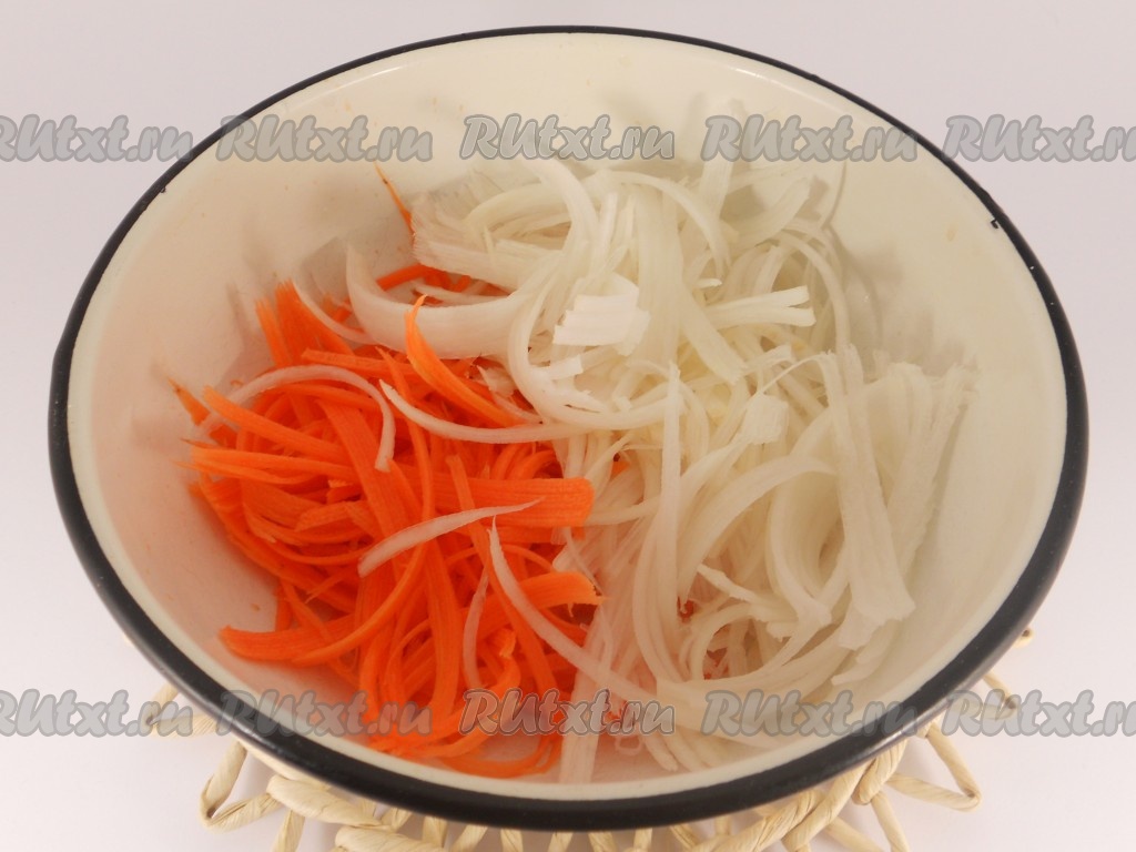 Лук очистить, нарезать на тонкие полукольца, выложить в сковороду, разогретую с растительным маслом, и обжарить до мягкости (в течение 2-3 минут) на среднем огне, помешивая, затем убрать с огня и дать немного остыть. Добавить лук к дайкону и моркови вместе с чесноком, пропущенным через пресс.