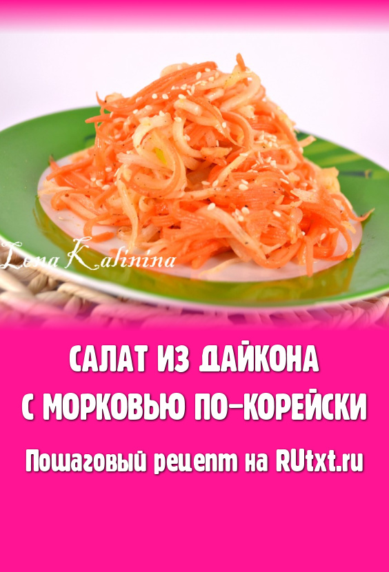 Хорошо салат перемешать и оставить в прохладном месте минимум на 1 час. Выложить готовый вкуснейший салат из дайкона с морковью по-корейски горкой на блюдо, посыпать кунжутом и подать к столу.