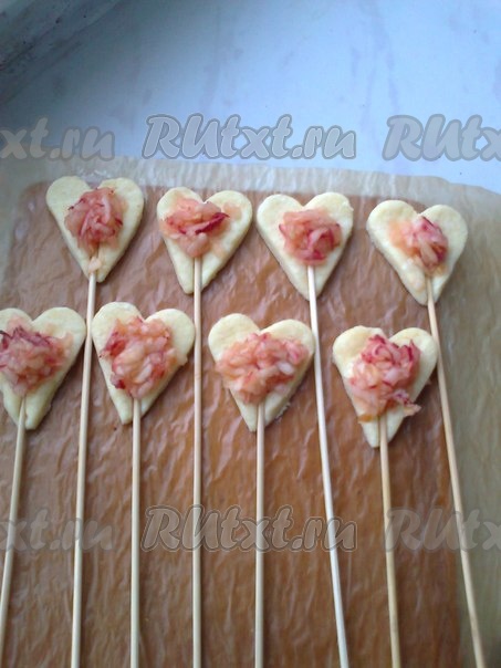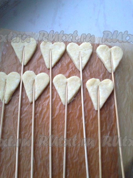 Раскатать тесто толщиной 0,3-0,5 см. Вырезать выемкой из теста заготовки  в виде сердечек. Сложить на пергаментную бумагу для выпечки.