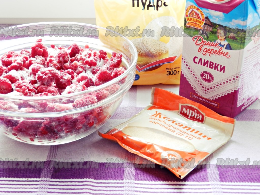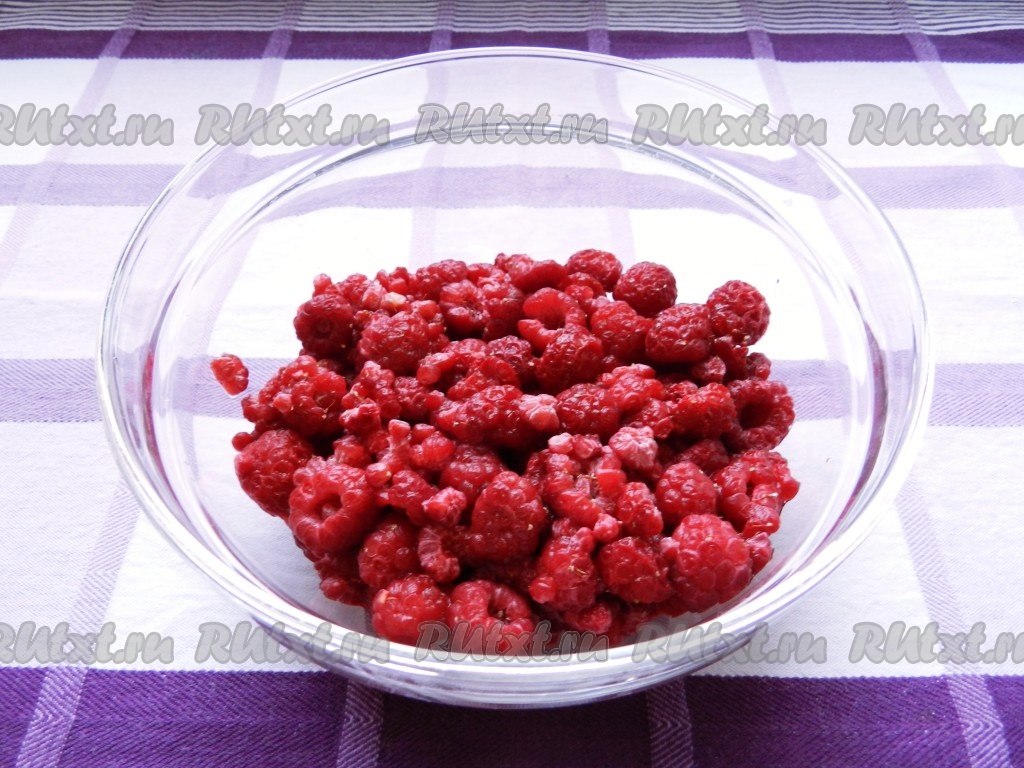 Подготовить продукты. Для этого десерта можно взять любые сочные свежие или замороженные ягоды. Я взяла замороженную малину, но можно взять и, например, чернику, ежевику, нарезанную на части клубнику. Свежие ягоды промыть водой, лишней воде дать стечь. Замороженные ягоды можно не размораживать.