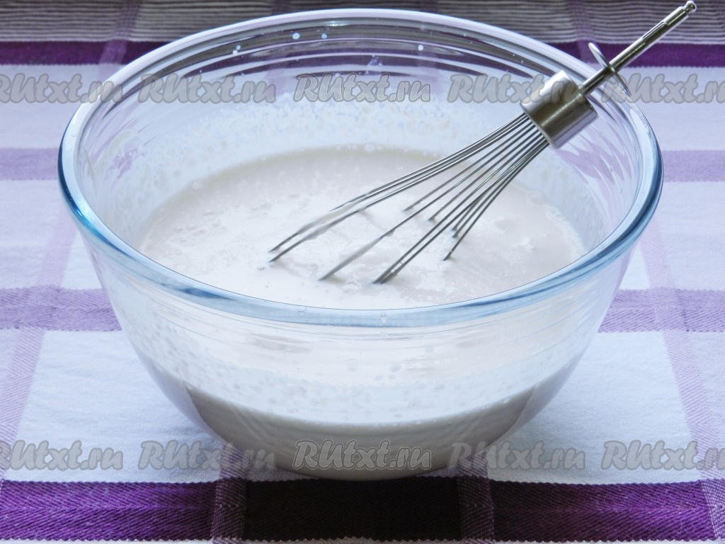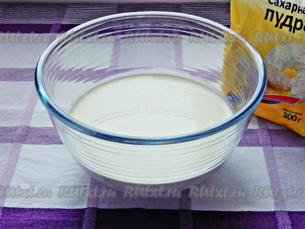 Оставшиеся сливки влить в глубокую миску, всыпать сахар (или сахарную пудру), тщательно перемешать.