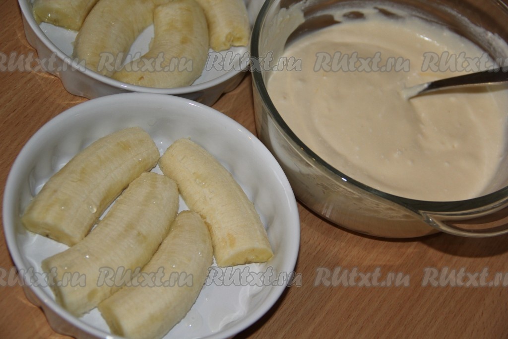 Творог лучше всего брать мягкий, жирностью не менее 5%. В глубокой миске соединить творог, яйцо, сахар и сметану, тщательно перемешать столовой ложкой (до однородности). Консистенция творожной массы должна получиться воздушной и нежной. Бананы почистить, разрезать в длину на 2 половины, затем каждую половинку разрезать поперёк на 2 части (при желании можно нарезать банан и кружочками). Выложить нарезанные бананы срезом вниз в один слой на дно двух формочек (или одной формы).