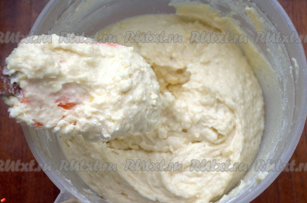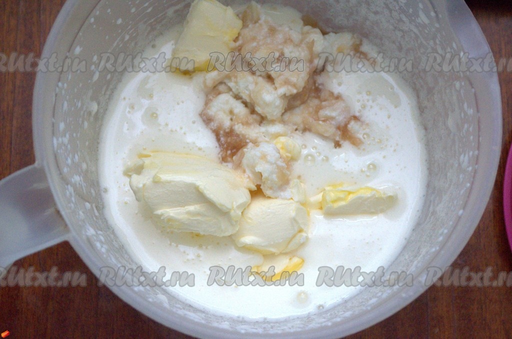 Яйца взбить с сахаром и солью в течение 5 минут. В получившуюся массу добавить размягченное сливочное масло и творог с яблочным пюре. Взбить до однородности.