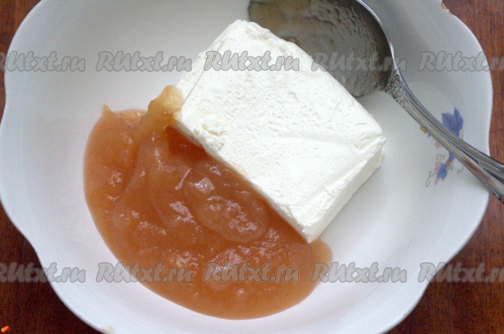 Творог (лучше взять сухой) перемешать с яблочным повидлом (без фанатизма).