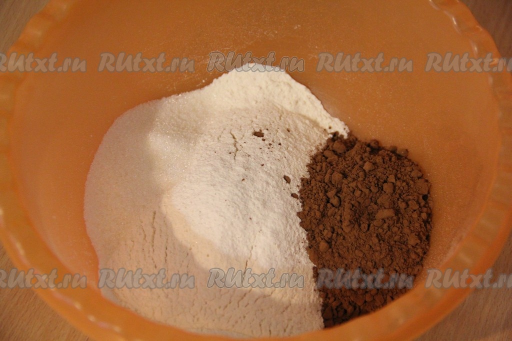 Просеять в миску муку, добавить какао, сахар, соль и перемешать.