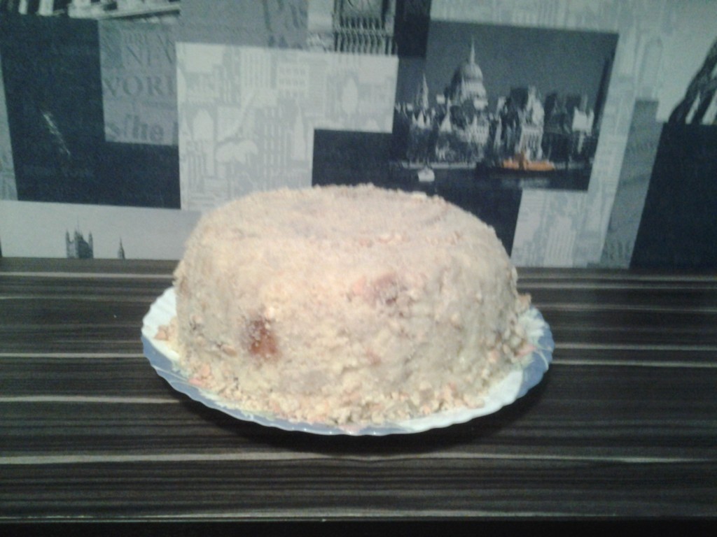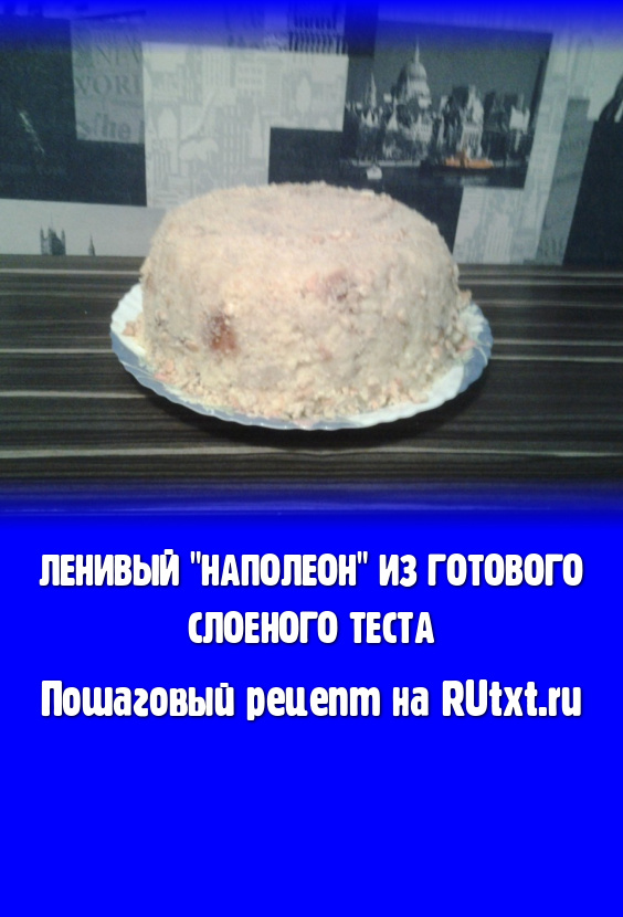 Охладить "Наполеон" в холодильнике и через часиков 5-6 можно доставать наше творение (а лучше, чтобы ночь постоял в холодильнике). Охлажденный и пропитавшийся торт достаём и переворачиваем на блюдо, снимаем фольгу. После этого приготовленный ленивый "Наполеон" надо посыпать крошкой от любого печенья или измельчёнными орехами!