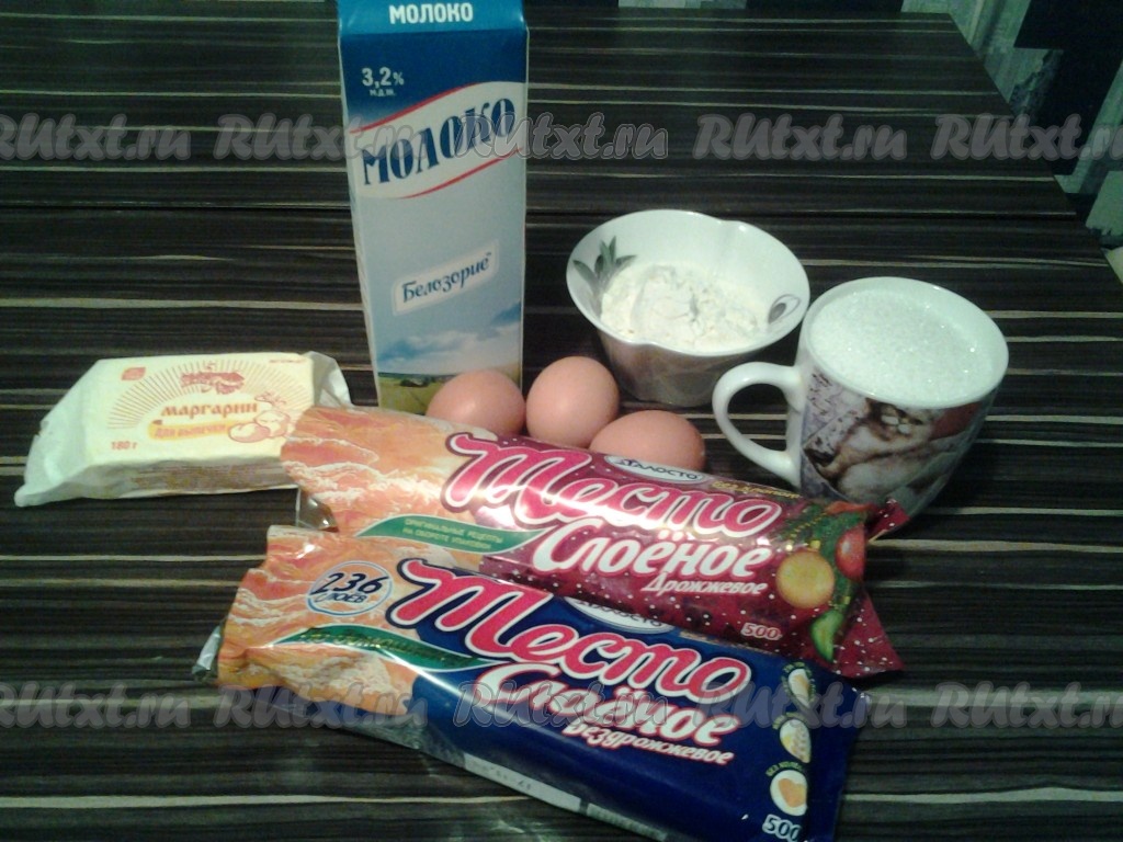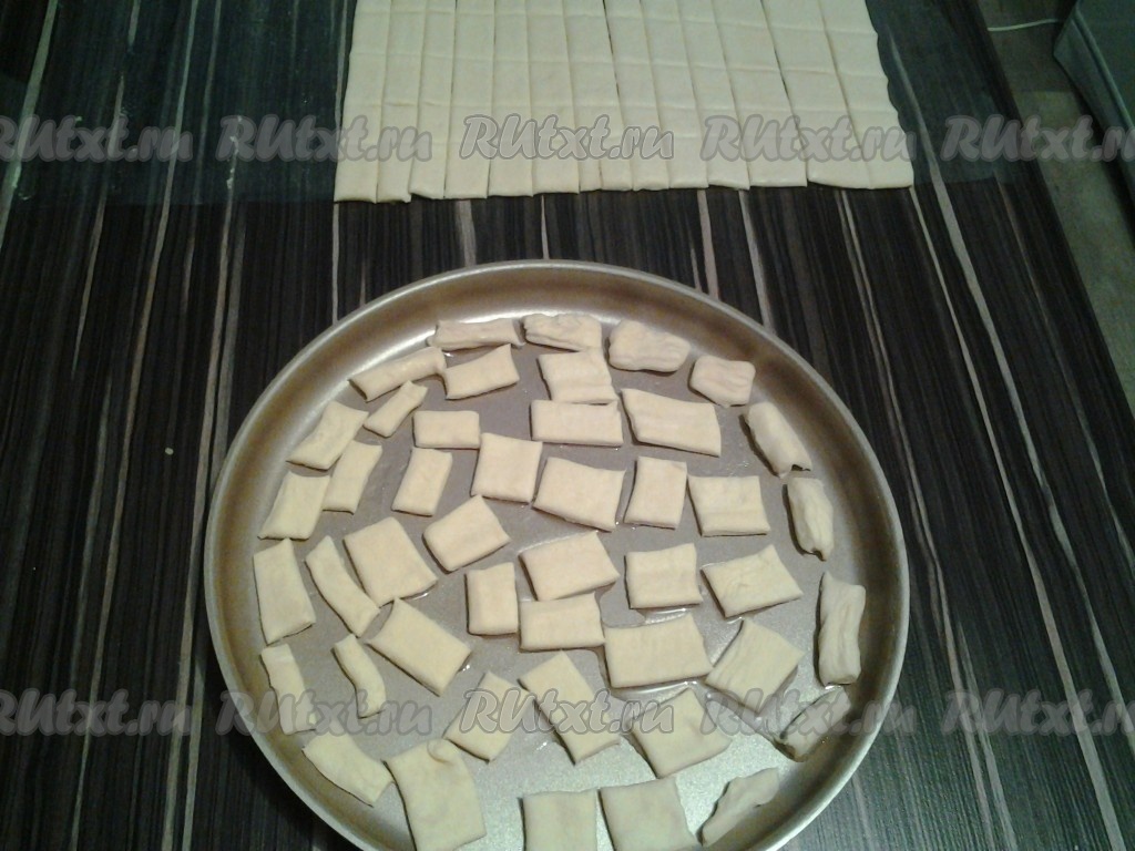 Разрезать слоёное тесто на маленькие квадратики. Положить кусочки слоеного теста на противень, смазанный растительным маслом, и поставить в разогретую духовку на 5-7 минут при температуре 180 градусов до появления лёгкой корочки (наблюдать, чтобы низ кусочков не подгорел).