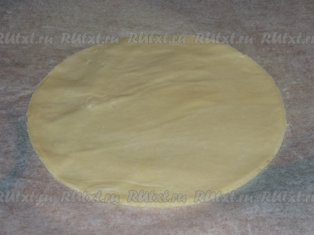 Каждую часть теста тонко раскатать (это лучше делать сразу на пергаменте). С помощью крышки вырезать из теста круг, наколоть вилкой, чтобы коржи не вздулись при выпекании.