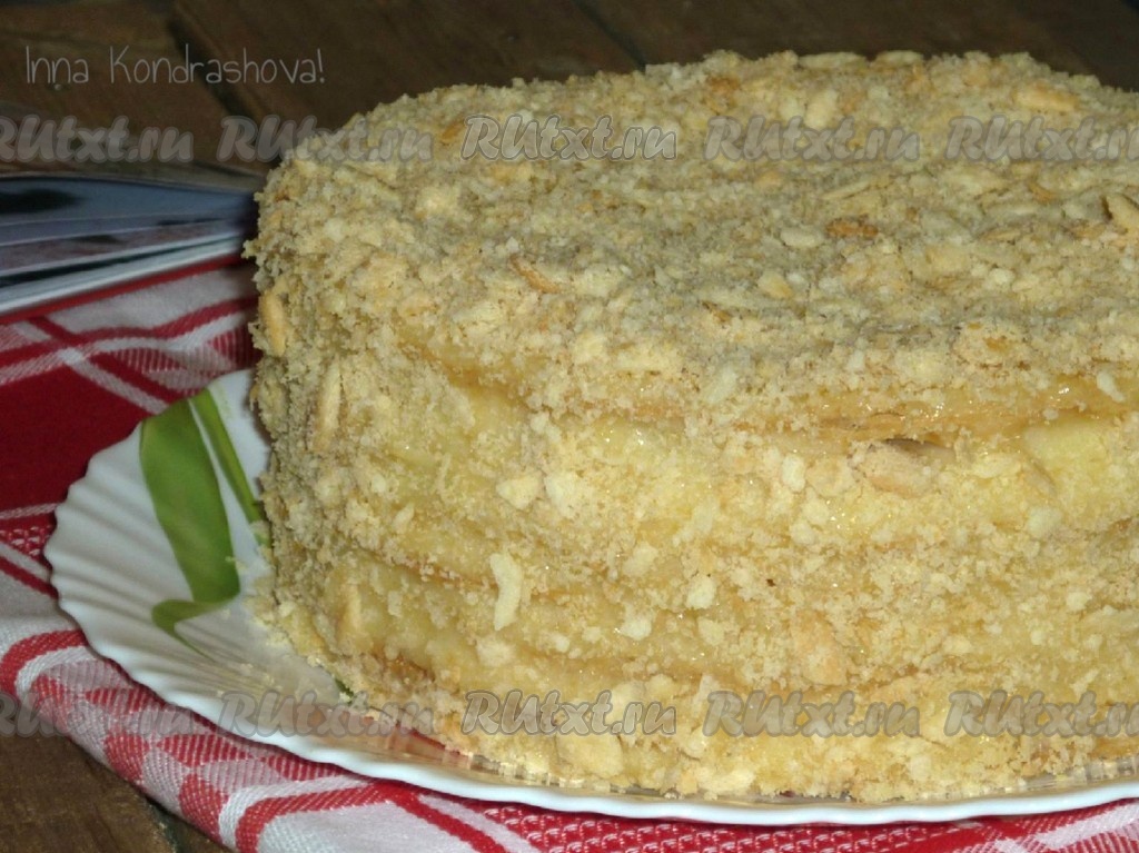 Торт "Наполеон" обильно обмазать заварным кремом сверху и с боков, посыпать подготовленной крошкой.