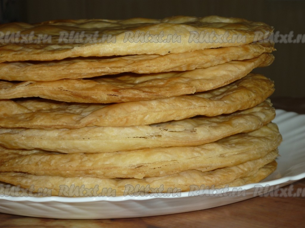В результате должно получится восемь румяных коржей, а из обрезков можно испечь ещё один корж, который можно будет использовать для посыпки торта.
