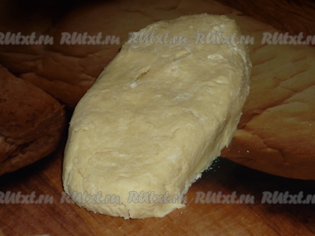 Приготовить тесто № 1. Для этого натереть холодное сливочное масло на тёрке и очень быстро смешать с мукой. Долго месить не надо, придать форму кирпичика, замотать в пищевую плёнку и положить на 45 минут в холодильник.