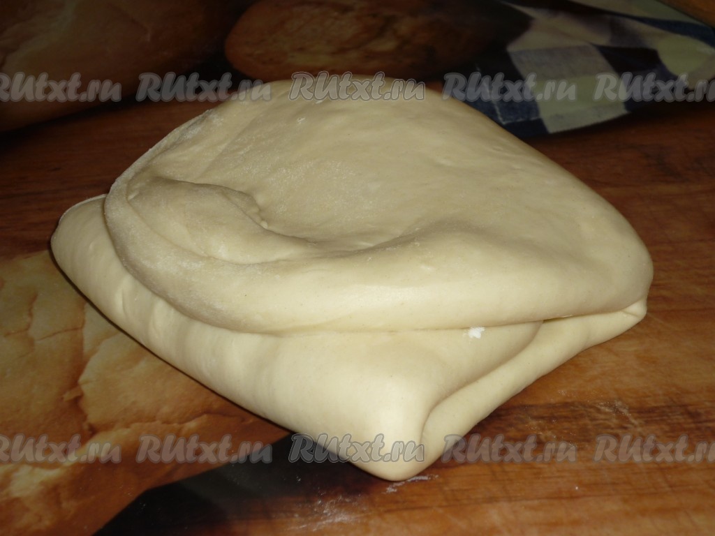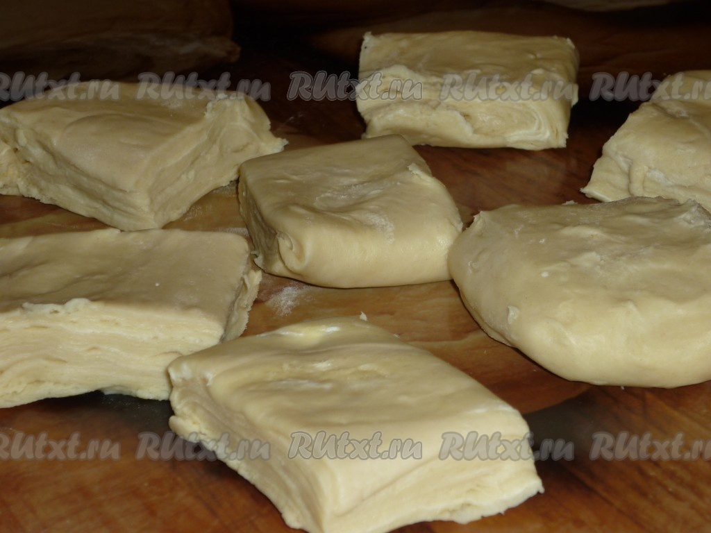 Достать тесто и снова раскатать в прямоугольный пласт толщиной 1-1,5 см, опять свернуть конвертом, отправить в холодильник на 10 минут. Эту процедуру повторить ещё два раза. Тесто готово. Разделить его на 8 равных частей.
