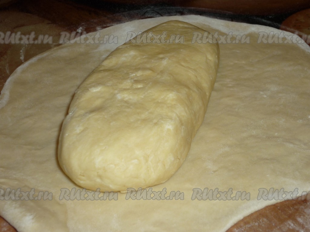 Тесто № 2 раскатать в прямоугольник, в центр выложить тесто № 1.