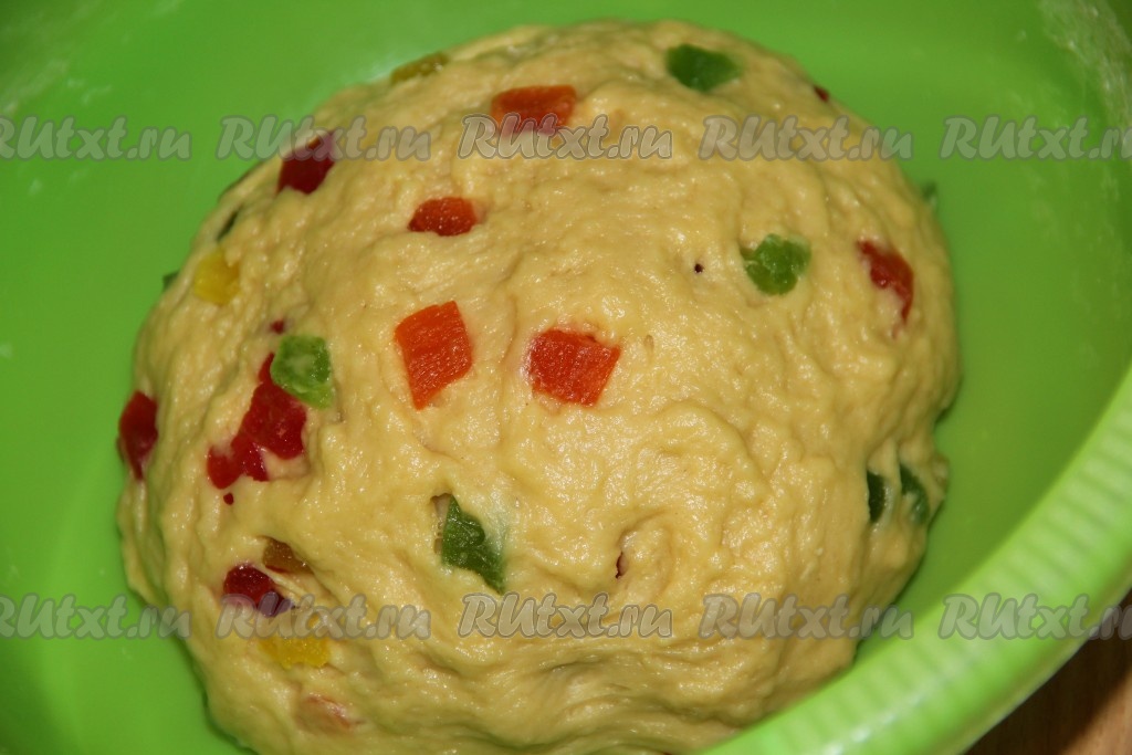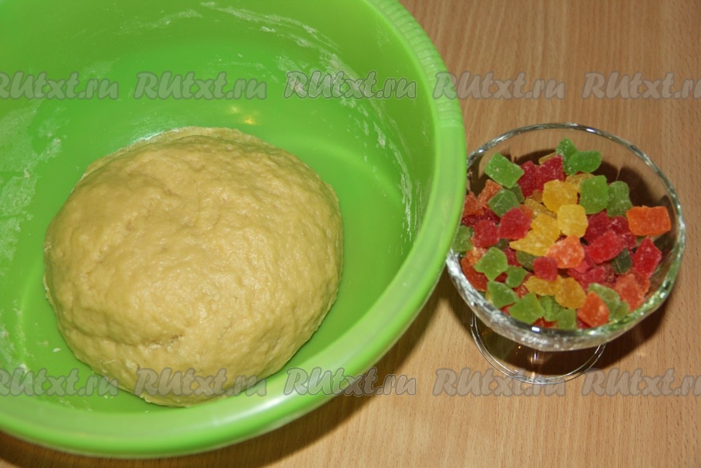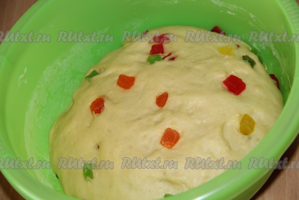 В конце замеса добавить цукаты и ещё раз хорошо вымесить тесто, чтобы цукаты равномерно распределились. Оставить готовое тесто в глубокой миске. Миску можно накрыть полотенцем или пищевой плёнкой и поставить в тёплое местечко на 1,5 часа.