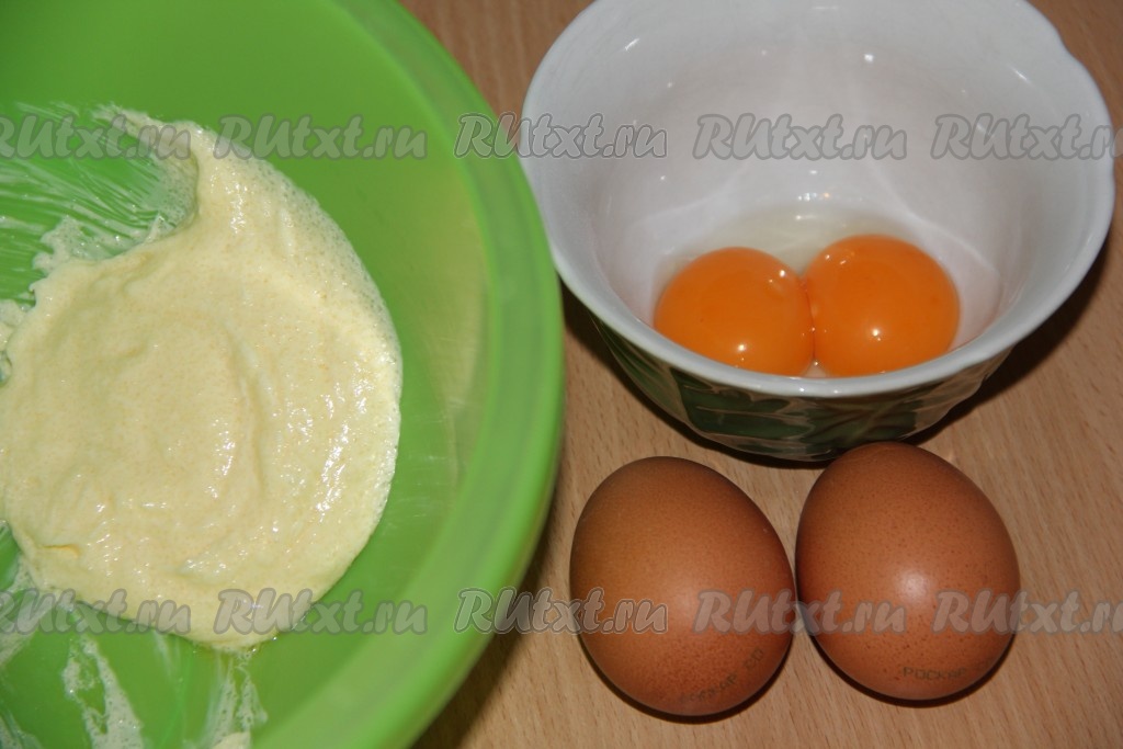 Затем добавить в масляную массу яйца и желтки, всё хорошо перемешать.