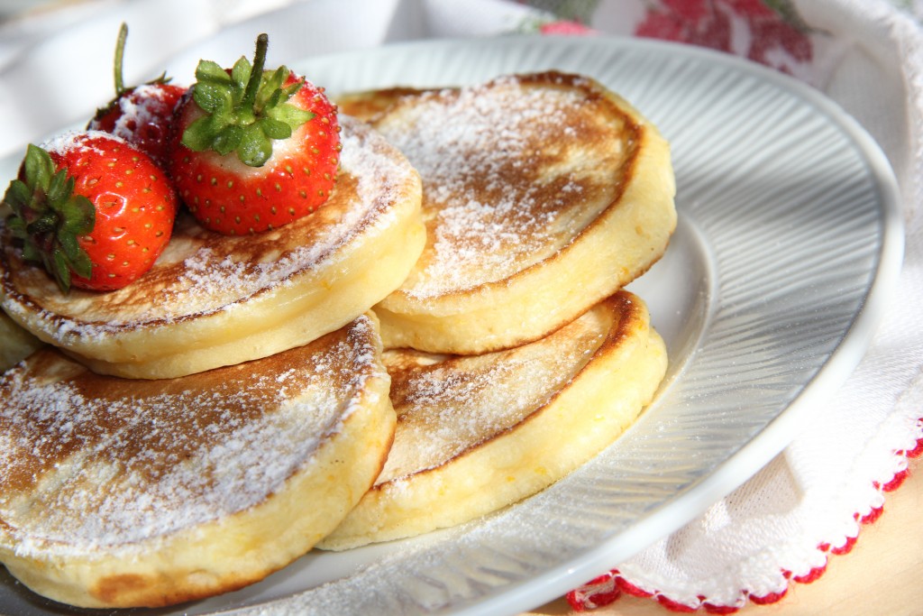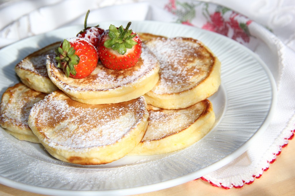 Вкусные, пышные оладьи на кефире, приготовленные по этому простому рецепту, подать с сахарной пудрой и свежими фруктами.
