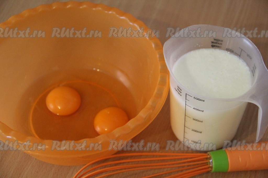 Яйца соединить с сахаром и слегка взбить венчиком. Затем добавить кефир и хорошо перемешать.