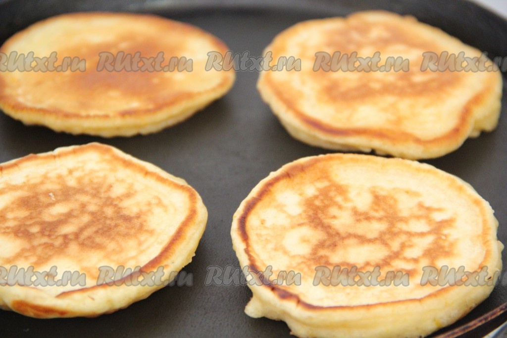 Сковороду для выпекания оладьев хорошо накалить. Перед выпеканием оладьев смазывать сковороду растительным маслом. Выкладывать в сковороду по 1 столовой ложке теста. Выпекать оладьи с двух сторон до золотистого цвета.
