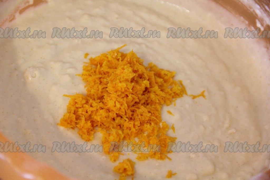 Апельсин хорошо вымыть и обсушить. Затем снять цедру с апельсина. Добавить апельсиновую цедру в тесто и хорошо перемешать.