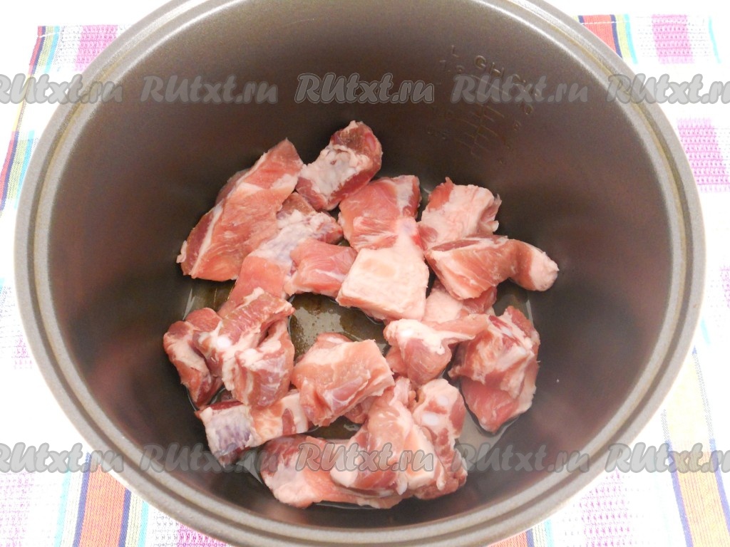 Ребрышки свиные порезать, поместить в чашу мультиварки. Добавить растительное масло. Выставить режим "Жарка" на 20 минут.