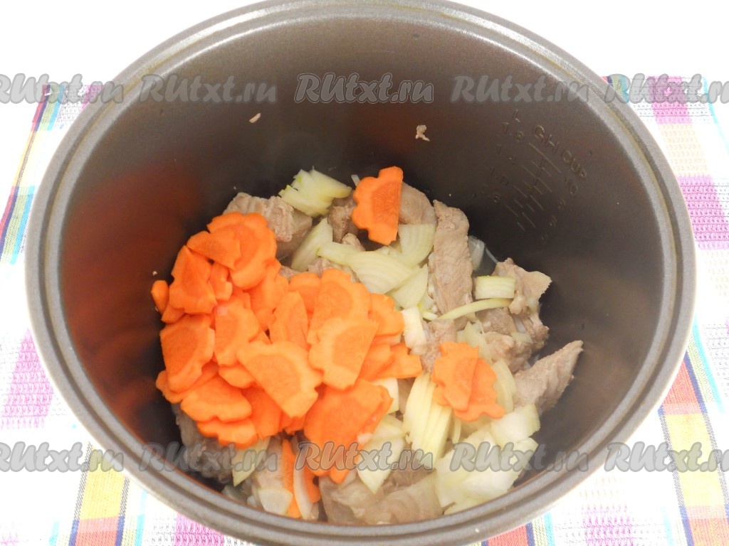Через 10 минут ребрышки перевернуть и добавить порезанный тонкими четвертинами лук и морковь, порезанную тонкими полукружочками. Готовить на том же режиме еще 10 минут до сигнала.