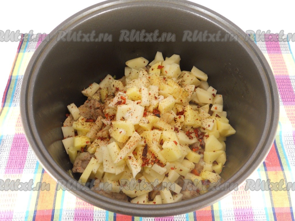 Картофель очистить и порезать небольшими кубиками. Добавить в чашу мультиварки. Посыпать специями и паприкой.