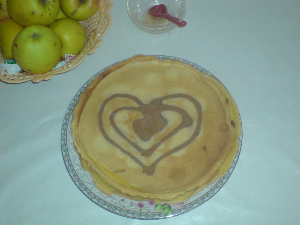 На разогретой сковородке быстренько рисуем рисунок и ждем пол минутки, чтобы тесто схватилось. Сверху наливаем обычное тесто и ставим на огонь сковородку. Поджариваем блин с двух сторон. Вот такие блины с рисунком у меня получились!
