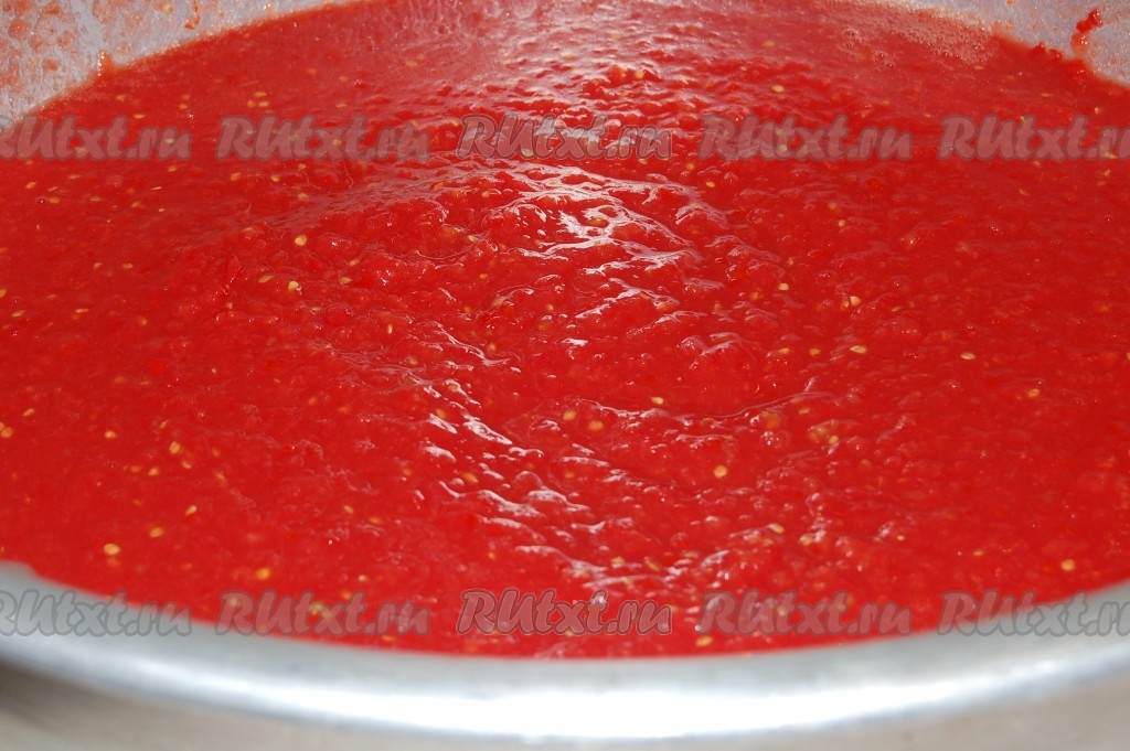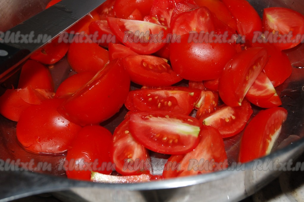 Пропустим помидоры через мясорубку, чтобы получилось томатное пюре.