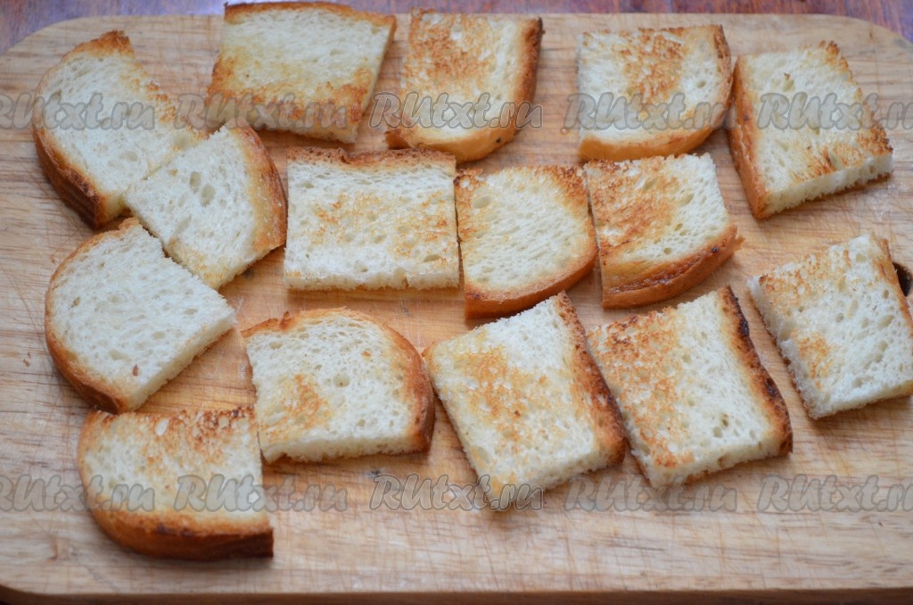 Обжарить нарезанные кусочки батона на сухой (или слегка смазанной маслом) сковороде с двух сторон до золотистого цвета. Остудить кусочки батона.