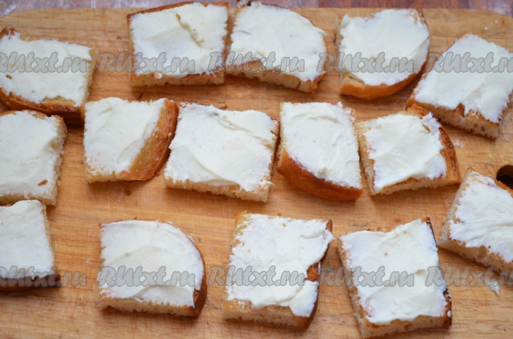 Намазать не толстым слоем обжаренные остывшие кусочки батона творожным сыром.