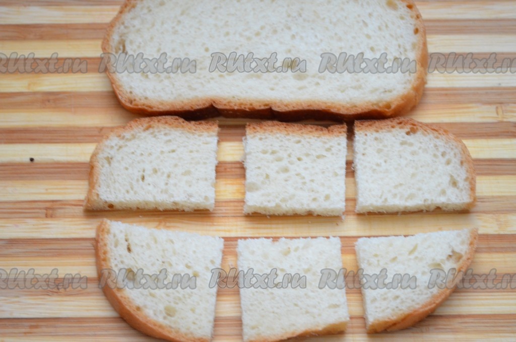 Батон нарезать на небольшие кусочки - квадратики.
