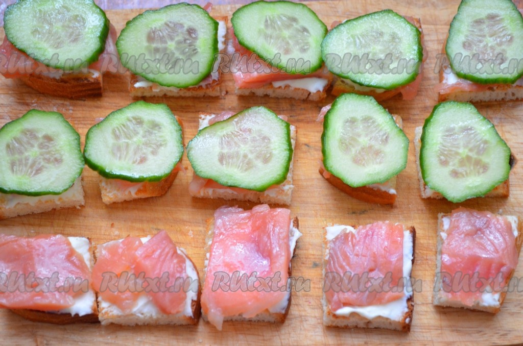 Красную рыбу нарезать на тонкие ломтики, равные по размеру кусочкам хлеба.