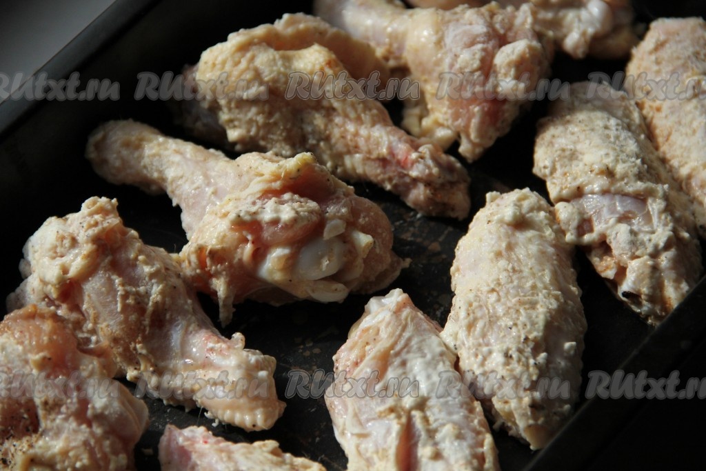 Выложить куриные крылышки в форму для запекания, заранее застеленную ковриком для выпечки (или пергаментной бумагой).