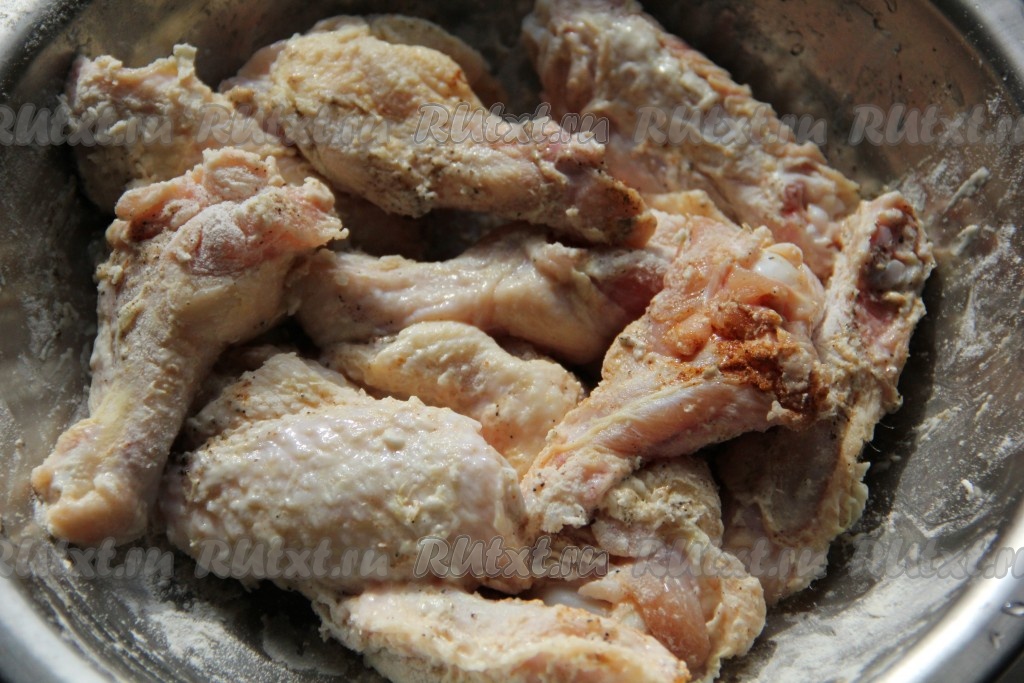 Смешать крахмал, паприку (или другие любимые специи) и соль. Добавить в эту смесь крылья и перемешать.