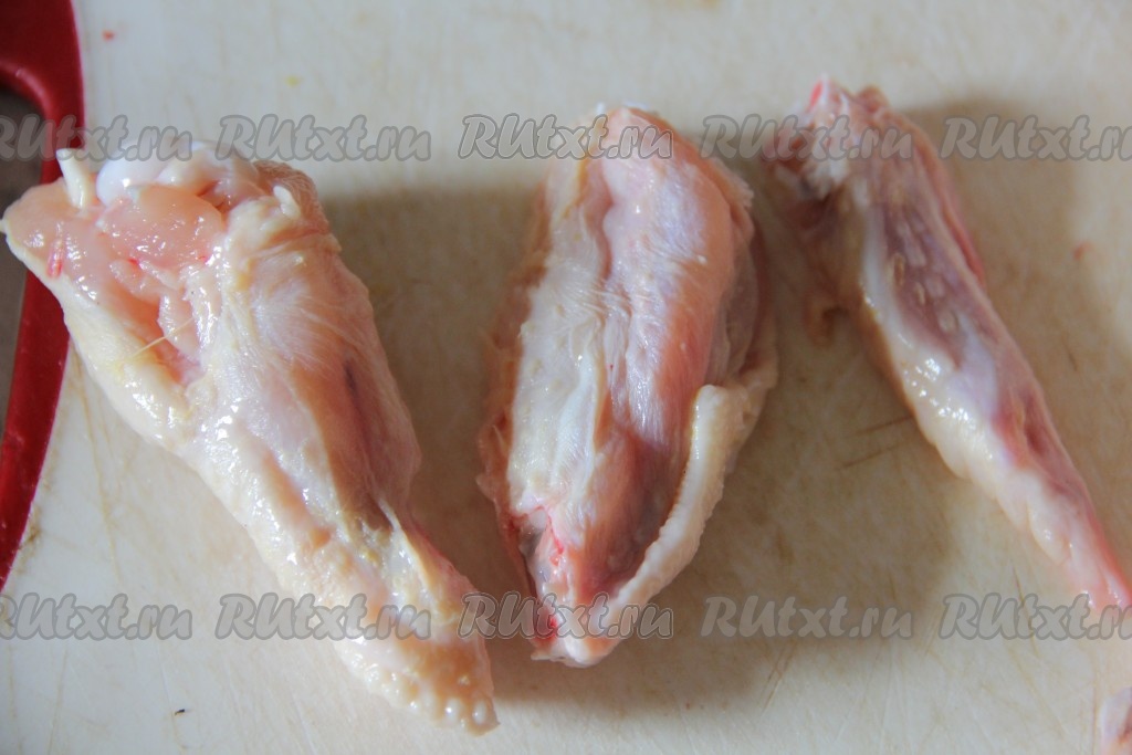 Крылышки помыть и обсушить. Крылья разрезать на три части: 2 крупные части каждого крыла мы будем запекать, а отрезанный "хвостик" практически не содержит мяса, поэтому его можно использовать для приготовления бульона или выкинуть.