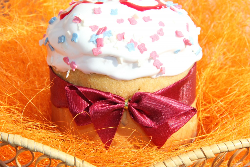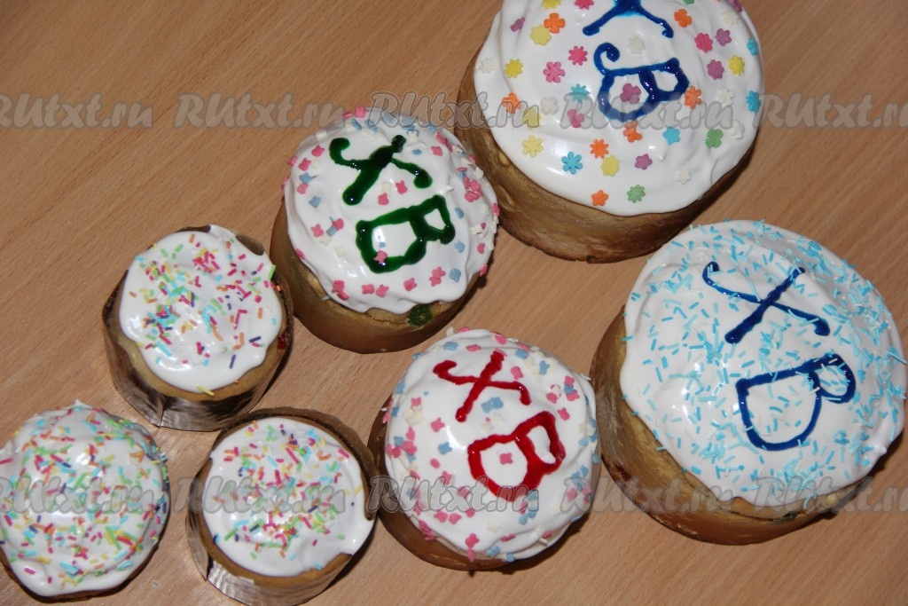 Украсить куличи глазурью или посыпать сахарной пудрой. Я покрыла куличи белковой глазурью. Для её приготовления аккуратно отделить желтки от белков так, чтобы не смешать белок и желток. Сахарную пудру просеять через сито. Выдавить лимонный сок и добавить к белкам. Взбить белки миксером в пышную пену, затем постепенно всыпать сахарную пудру, продолжая взбивать белки до образования стойких пиков. Нанести глазурь на куличи, украсить цветной посыпкой.