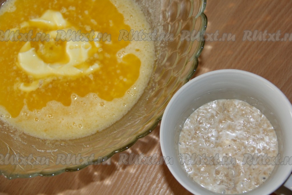 Масло растопить и слегка остудить. Влить в яичную смесь растопленное масло, подошедшие дрожжи, добавить соль. Всё хорошо перемешать.