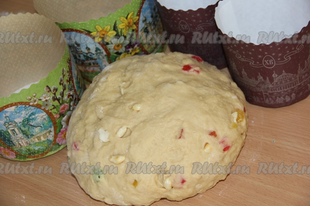 Тесто разложить по формам, заполняя их на 1/3 объёма. Накрыть формы с тестом полотенцем и оставить в тёплом, без сквозняков, месте на 3-4 часа. Я использовала бумажные формы для куличей, можно выпекать куличи в жестяных или силиконовых формах, предварительно смазав их растительным маслом.